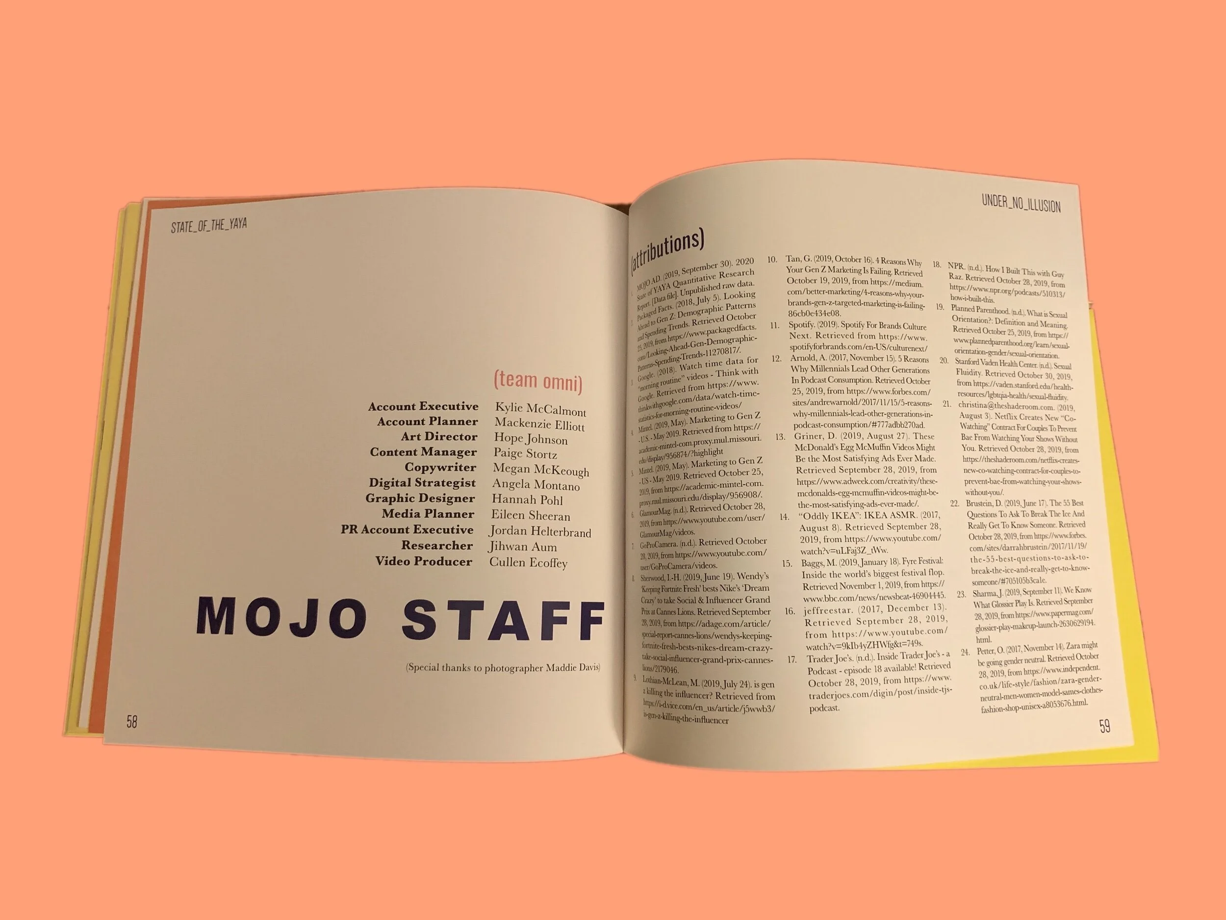 Split into teams of 11, we were tasked with completing a volume of the State of the Youth and Young Adult Market Report. This research dives into the behaviors of 18-to 24-year-olds. We are specialists within this demographic because we fall into it! OMNI, my fall semester team, completed the Duality volume.